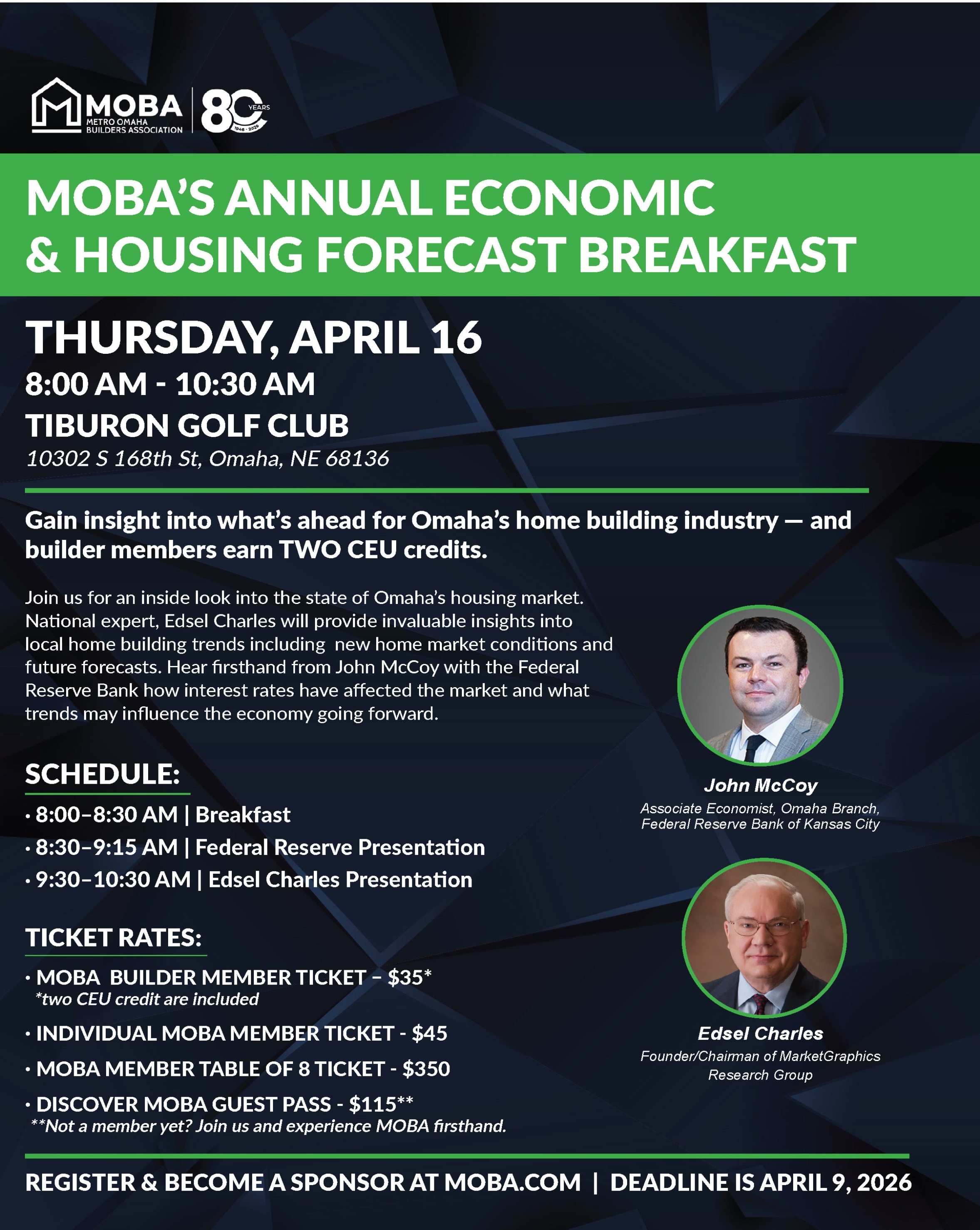 Join us for an inside look into the state of Omaha’s housing market. National expert, Edsel Charles will provide invaluable insights into local home building trends including new home market conditions and future forecasts. Hear firsthand from John McCoy with the Federal Reserve Bank how interest rates have affected the market and what trends may influence the economy going forward.